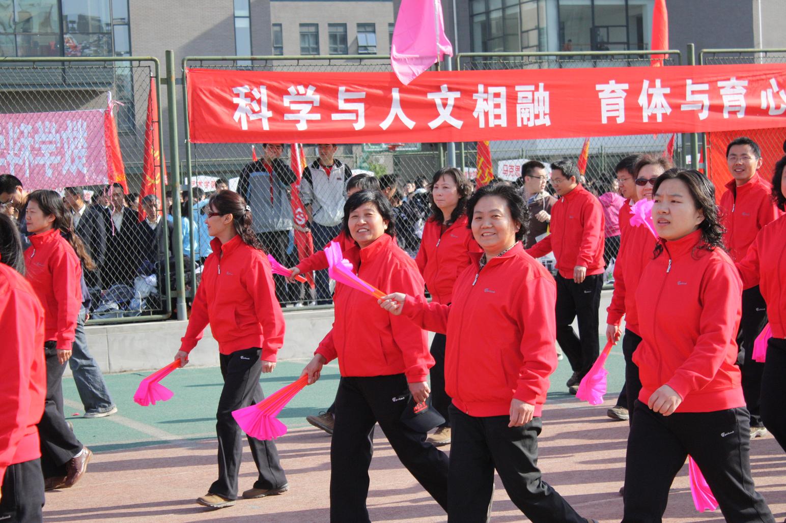 在团体操表演中,数学的表演队伍和谐划一,舞步翩跹,教学科研一线的老师从紧张的工作中抽身出来,投入到“手舞足蹈”当中,与其它院系相比,尤其引人注目的是十七位男老师的表演,他们刚柔并济,更见风采,举手投足间足见小教员和各位表演者平日所下功夫之深。