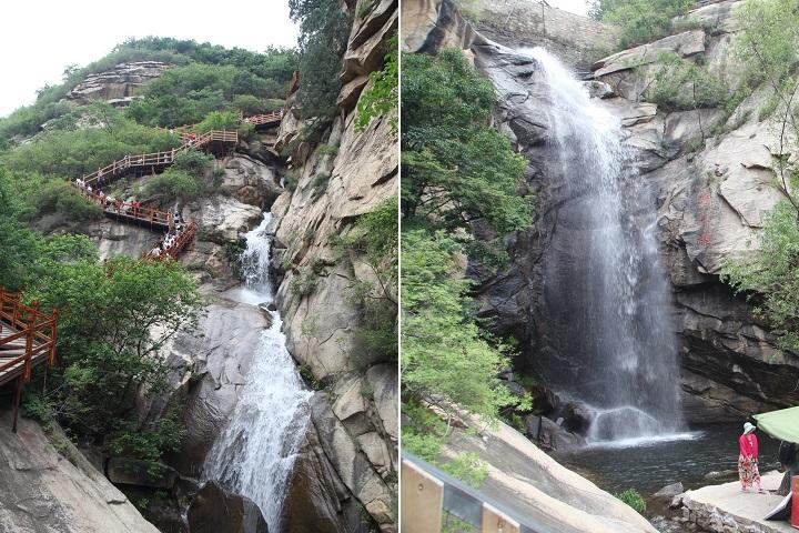 湖的另一侧不多远,迎面而来的是顺着山涧石缝奔泻而下的一川瀑布,蜿蜒高耸的木质台阶在一侧静候大家的征服。很多台阶高差较大,对年事已高的离退休老师们是不小考验。不少中青年老师们主动挑起了照顾长者的担子,大家彼此扶持协助,沉稳有序地向上攀登。随行的小朋友们也很快打成一片,为大部队带来了欢笑与活力。一路途径迎仙瀑和喜仙瀑,老师们在三潭叠泻处的小亭稍作歇息后,又一鼓作气攀至坝上的清凉湖。湖中竹筏条条,大伙欢声阵阵。