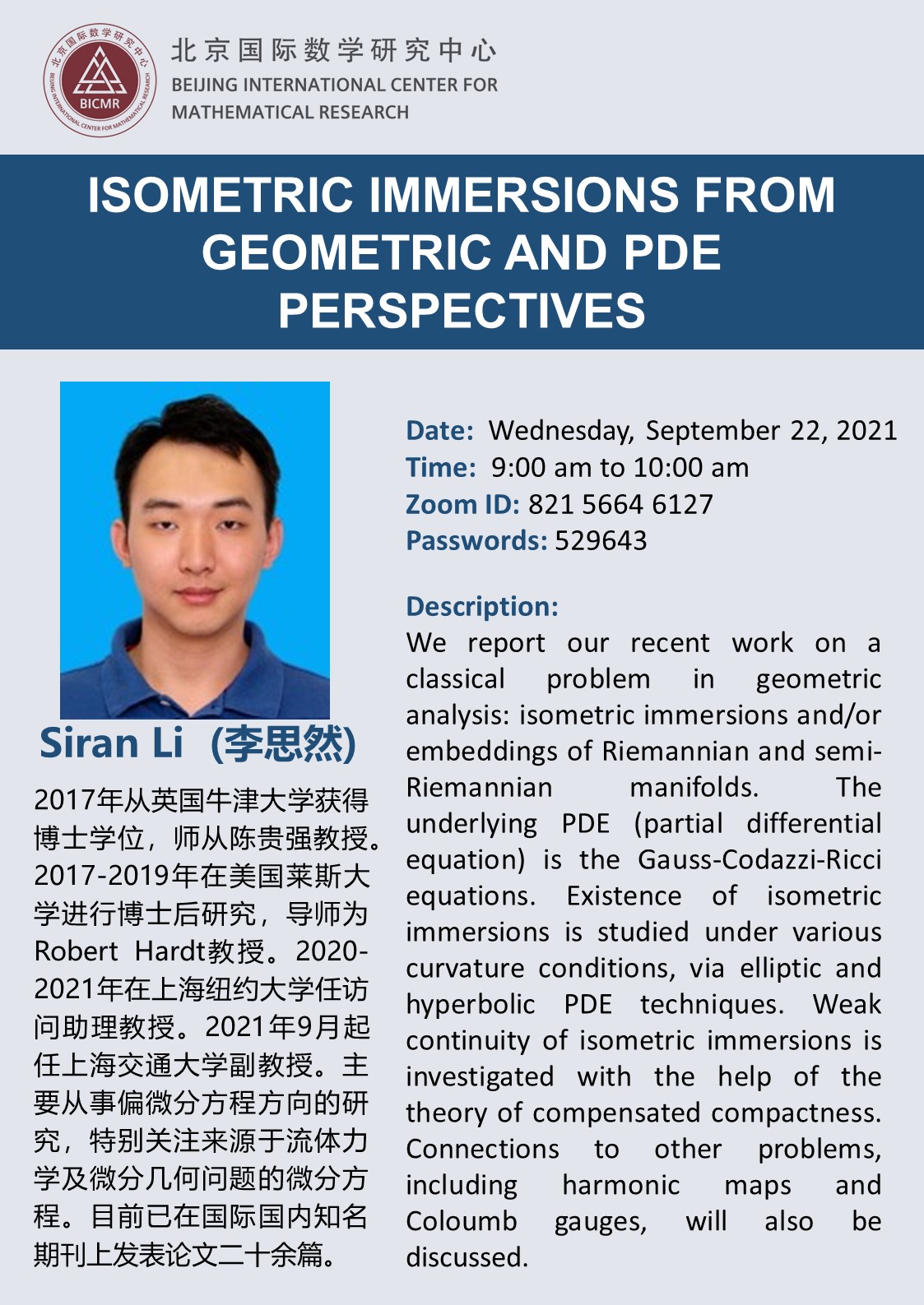 2017年从英国牛津大学获得博士学位,师从陈贵强教授。2017-2019年在美国莱斯大学进行博士后研究,导师为Robert Hardt教授。2020-2021年在上海纽约大学任访问助理教授。2021年9月起任上海交通大学副教授。主要从事偏微分方程方向的研究,特别关注来源于流体力学及微分几何问题的微分方程。目前已在国际国内知名期刊上发表论文二十余篇。