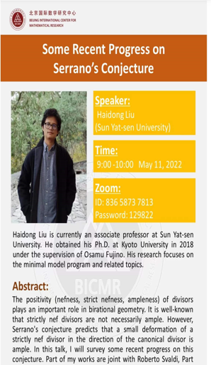 Haidong Liu is currently an associate professor at Sun Yat-sen University. He obtained his Ph.D. at Kyoto University in 2018 under the supervision of Osamu Fujino. His research focuses on the minimal model program and related topics.