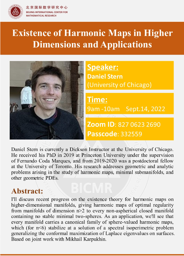Daniel Stern is currently a Dickson Instructor at the University of Chicago. He received his PhD in 2019 at Princeton University under the supervision of Fernando Coda Marques, and from 2019-2020 was a postdoctoral fellow at the University of Toronto. His research addresses geometric and analytic problems arising in the study of harmonic maps, minimal submanifolds, and other geometric PDEs.