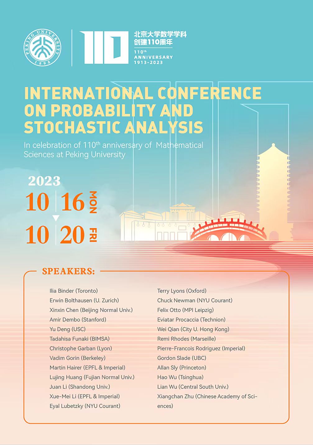 Participation of this conference is free but registration is required. Participants should arrange their own accommodation and meals. Participants from outside Peking University also need pre-arrangement to access the PKU campus. Those who need arrangement of access to the campus should register by Monday, 25 September. PhD students and postdocs should also ask their academic advisor to write a reference letter and send to probability@math.pku.edu.cn by the same date.