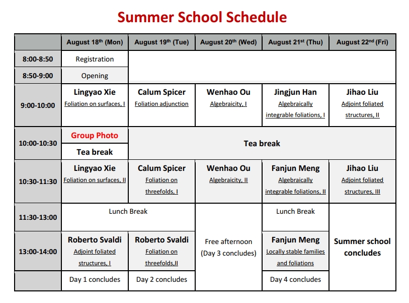 This summer school is primarily aimed at researchers who are currently working or planning to work in foliation theory or birational geometry. Postdocs, PhD students, and advanced undergraduates are warmly welcomed. The summer school will begin with preliminary topics such as foliations on surfaces, then systematically cover foliations on threefolds, adjunction formulae, algebraicity, algebraically integrable foliations, locally stable families and foliations, and adjoint foliated structures. Lectures will cover the most recent advanced results and discuss potential future research directions.