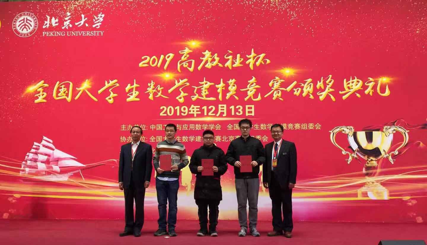 “高教社杯”全国大学生数学建模竞赛是全国高校规模最大的基础性学科竞赛,也是世界上规模最大的数学建模竞赛,2019年近12万名本科生组建39293队报名参赛,我院2018级本科生倪弘康、梁圣通、孙鸿儒组成的队伍在所有队伍中脱颖而出,获得本科生组第一名,这是北京大学首次获得此项荣誉,也是北京地区高校近10年唯一一次获得此项荣誉。我院同学同时斩获1组全国一等奖,1组全国二等奖,6组北京市一等奖、6组北京市二等奖。