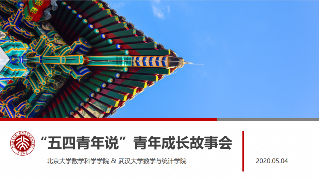 5月4日下午,北京大学数学科学学院与武汉大学数学与统计学院联合举办“五四青年说”青年成长故事会,两院青年同上一堂成长课。北京大学数学科学学院院长陈大岳,金融数学系主任吴岚,北京大学援鄂医疗队“90后”党员、北京大学第一医院内镜中心护士郭新月,学生代表季策、蔡展晖、林涅,与两校青年学子分享成长故事,云端共话成长。北京大学数学科学学院党委书记胡俊出席活动,院党委副书记董子静主持。