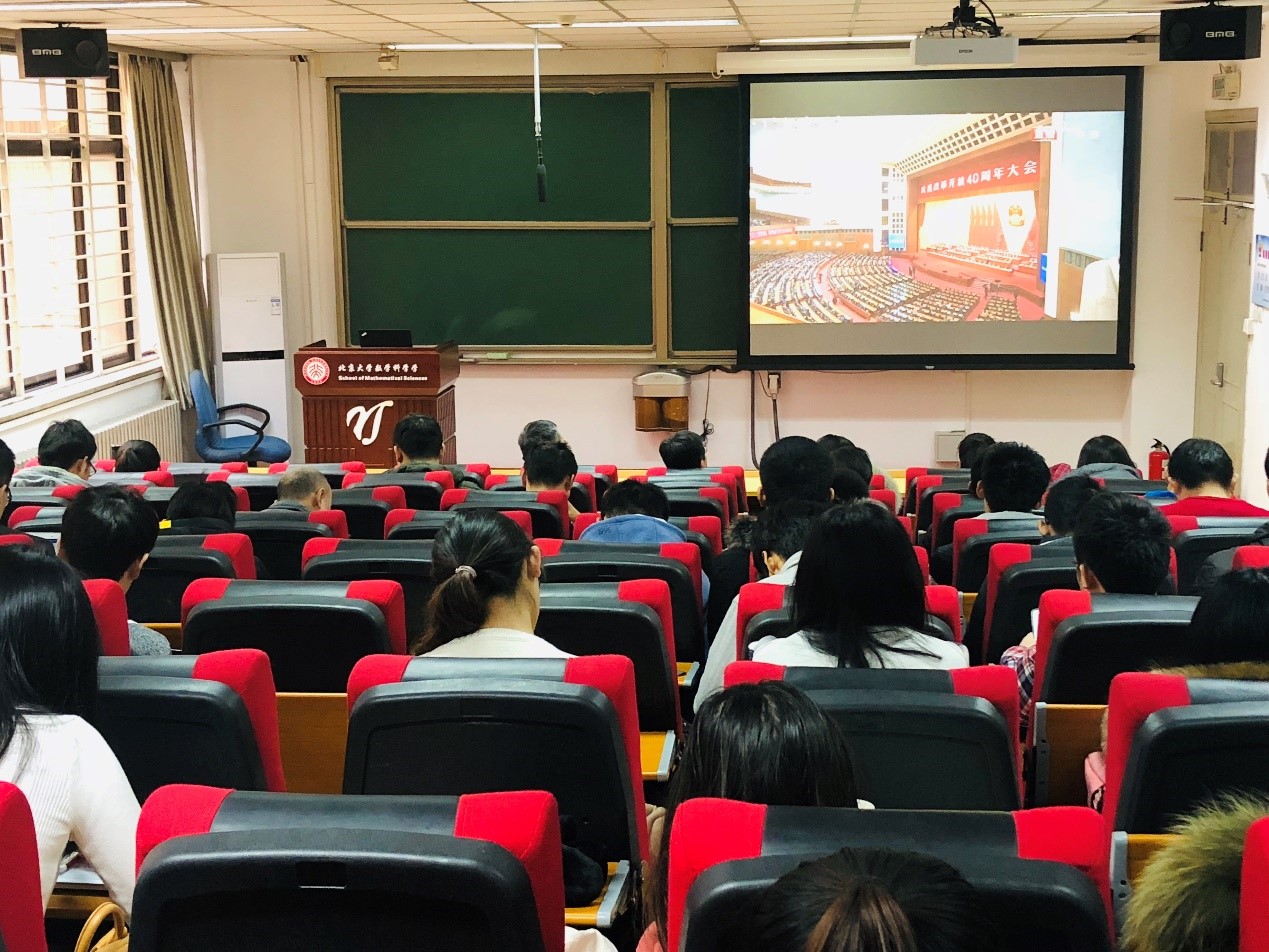 12月18日上午9:50,数学科学学院本硕博各年级学生党支部、党的知识培训班和党性教育读书班学员、入党积极分子及部分班团骨干来到理科一号楼1114会议室,与院长陈大岳、党委副书记孙赵君和学院教职工代表共同观看庆祝改革开放40周年大会直播,共同回顾改革开放40年的光辉历程,持续增强不忘初心继续前行的决心与信心。