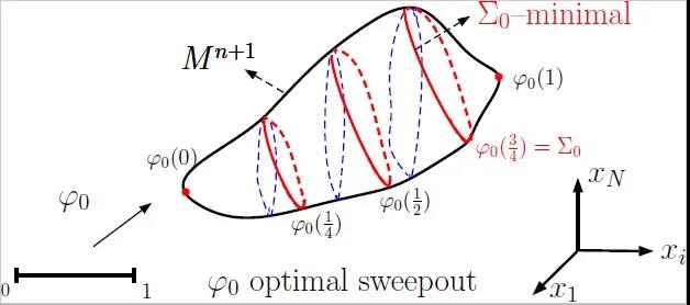 极小曲面的问题是上述问题在三维的自然推广:对一个三维球面,我们如果要选取其上二维的面积最小的曲面,也会遇到同样的问题:曲面会缩到一点。类似于上面的方法,我们可以寻找一个覆盖三维球面的单参数的曲面族,让它从北极出发一路覆盖到南极点。基本的想法是其中每一个曲面都要缩小自己的面积,但整体的曲面族无法缩到一点,这样就可以找到期望的极小曲面。因为这个想法是先选取曲面族中最大的面积,再对所有的极大值取下确界,所以这个方法被形象地称为min-max方法。基于这样的想法,美国数学家Almgren从上世纪60年代到80年代利用几何测度论的工具,最终证明了这样的构造可以帮助我们得到三维球面上的弱意义下的极小曲面,而他的学生Pitts则进一步证明了这种构造的正则性,即解是光滑的。2012年,Marques-Neves开创性地使用了Almgren-Pitts发展的min-max理论,证明了Willmore猜想,进而促进了min-max理论的飞速发展。Almgren-Pitts理论自然可以对k-参数曲面族做min-max构造(见下文),但注意到几何测度论构造出来的解,永远是带有整数系数(重数)的光滑曲面,这就意味着我们在k-参数曲面族中构造的极小曲面,可能仅仅是单参数(或者小于k-参数)曲面族构造的极小曲面乘以一个整数(将极小曲面视为方程组的解),因而不会得到新的极小曲面。然而如果我们可以证明k参数曲面族构造的解都是重数1,那么我们就可以说明这些新构造的解本质上都是全新的,而不是既有理论的解的整数倍。由此Marques-Neves提出了重数1猜想,认为这些k参数族构造的极小曲面在generic情形都是重数1的。