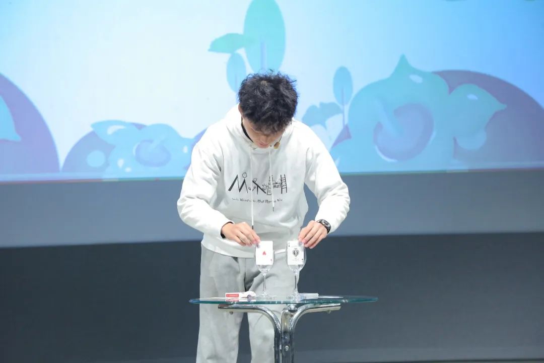 暖场环节,学院2021级本科生李鸣翀以一首歌曲《最伟大的数学》,带领大家回顾数学学科的发展历史,细数伟大的数学家与重要的数学命题。2022级本科生闫索用纸牌魔术向大家展示了数学中的概率问题。他通过魔术表演告诉大家,研究数学是一个不断解谜的过程,谜题千变万化,需要我们不断扩展思路,发现奥秘。