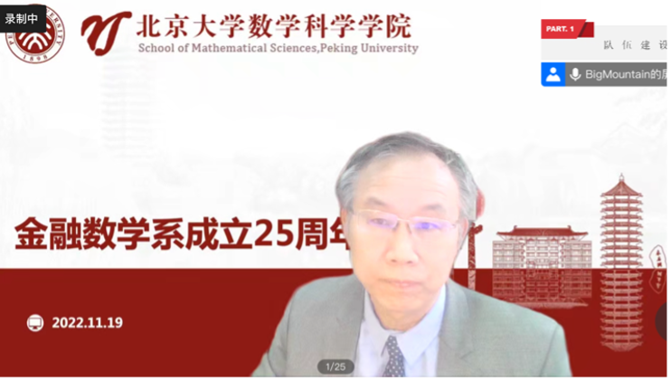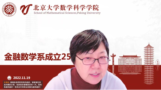 2022年11月19日,北京大学数学科学学院金融数学系成立25周年系庆活动于线上举行。北京大学数学科学学院院长陈大岳教授出席活动并致辞,数学科学学院师生、院友及关心金融数学系的各界人士400余人参加本次系庆活动。活动由数学科学学院金融数学系主任吴岚教授主持。