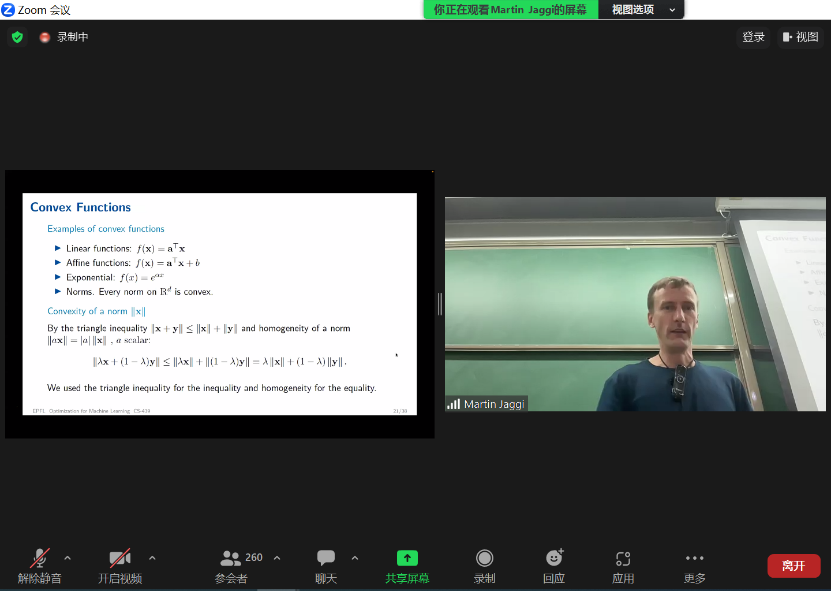 其中,北京应用物理与计算数学研究所的王涵研究员讲授课程“分子动力学模拟和深度学习”,介绍了分子动力学模拟的基本原理,以及深度学习方法在原子间相互作用建模和稀有事件采样等问题中的应用。牛津大学的Philip Maini教授讲授课程“Emergent Phenomena in Mathematical Models for Biology and Medicine”,介绍了数学生命科学研究中的基础理论、建模计算方法及前沿应用。洛桑联邦理工学院的Martin Jaggi教授讲授课程“机器学习的优化理论与算法”,介绍了适用于机器学习和数据科学中应用的现代优化方法。斯坦福大学的李志远助理教授讲授课程“深度学习理论”,介绍了深度学习优化理论和泛化理论的相关内容。